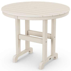 This traditional dining table brings friends and family together with its ample tabletop space, durable frame, and attractive looks. The 36" Round Farmhouse Dining Table can hold any large meal you place on it and hold up to any weather condition that touches it. Gather a few complementing POLYWOOD dining chairs around this table and you'll have a comfortable and stylish setting where you and your loved ones can make wonderful memories together.