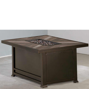 Chatham Fire Table by Agio has an aluminum chat height frame with a 52 x 32 porcelain tile top and powder coat finish. Includes amber luster glass fire beads for the standard 40,000-60,000 BTU LP gas fire bowl. Easy lift off door for access to LP Tank (20 lb tank not included). Bonus: Fire table includes: natural gas conversion kit, burner cover and protective weather cover. Assembly required. Ships in two cartons.