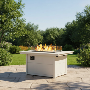 Includes cover, stainless steel burner bowl, glass wind guard, and glass gems. Turn the flames on and off with the push of a button. Fits 20 lb. propane tank (not included); can be hooked up to natural gas line. Safe to use on most firm, flat outdoor surfaces. Always a bright idea for alfresco entertaining, our Rectangle 34" X 46" Fire Pit Table is easy to use and requires minimal maintenance. The flames ignite with the push of a button, generating ambient heat and a mesmerizing glow. Complete with safety enhancements and a cover, it's a favorite for families and great for shifting seasons.